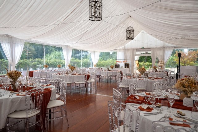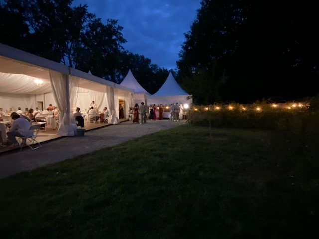 • Nous mettons à votre disposition une grande tente de réception de 180 m², installée en pleine verdure — avec plancher en parquet et plafond en vélum. Grâce à ses parois vitrées, elle laisse entrer la lumière et offre une vue directe sur le jardin, pour un effet « dedans-dehors » très élégant. (Les Chemins de la Rose)